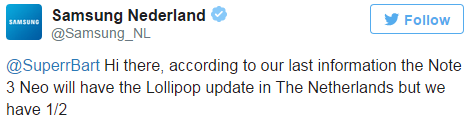 Несмотря на то, что в конце этого месяца на конференции для разработчиков Google I/O 2015 ожидается релиз следующей версии операционной системы Android, известной под кодовым названием Android M, компания Samsung продолжает весьма неспешно обновлять свои устройства до Android 5.0 Lollipop. Нидерландское подразделение Samsung в Twitter объявило, что Galaxy Note 3 Neo, который является доступной версией оригинального Galaxy Note 3, получит обновление операционной системы до версии Android 5.0 позже в этом году.