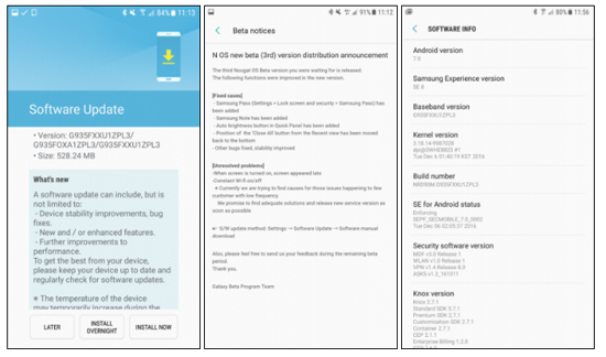 Среди прочих изменений в третьей бете Android 7.0 Nougat для Galaxy S7 и Galaxy S7 Edge стоит отметить появление функции Samsung Pass, новое приложение Samsung Note, переключатель автоматической яркости был добавлен в меню быстрых настроек, а кнопка закрытия всех запущенных приложений перенесена в нижнюю часть экрана. Обновление также включает патч безопасности за 1 декабря.