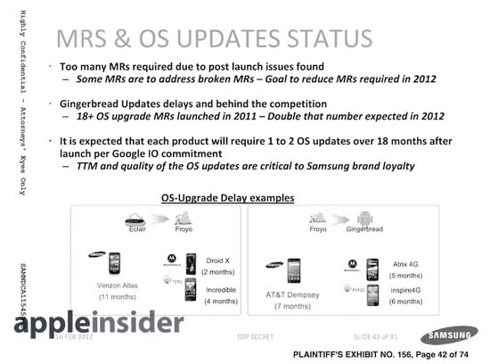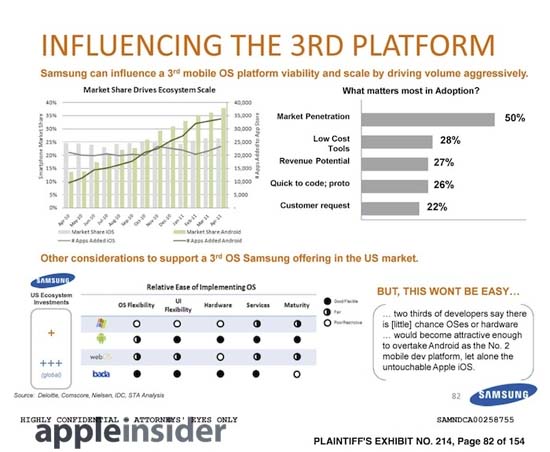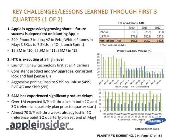 Представленный в суде документ описывает трех основных врагов компании в достижении собственных целей. На первом месте находится Apple с агрессивно растущей долей рынка. Приоритет победы над компанией из Купертино уже был обозначен в другом продемонстрированном во время суда документе. Вторым врагом оказалась HTC, которая «работает на высоком уровне», а третьим основным врагом Samsung указала саму себя, называя свой бренд слабым.