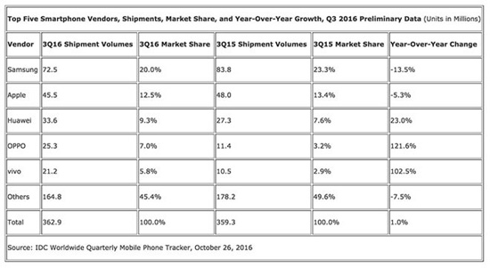 Пятерку ведущих производителей смартфонов возглавила Samsung. Однако доля южнокорейского производителя за год сократилась с 23,3% до 20,0%, поскольку поставки уменьшились с 83,8 до 72,5 млн штук. Немалую роль в этом сыграло фиаско Galaxy Note 7, который был отозван из продажи из-за риска самопроизвольного возгорания.
