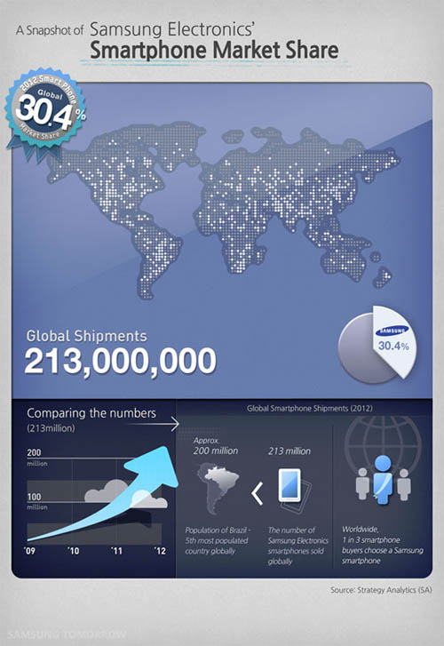 В результате, компания уверенно стала крупнейшим в мире производителем смартфонов - каждый третий смартфон, поставленный в 2012 году, имеет логотип Samsung.