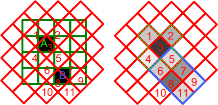 Правда, эта технология имеет свои недостатки: на данный момент практически весь контент существует в традиционном формате пикселей и, следовательно, для отображения на "бриллиантовом" дисплее необходимо активировать дополнительное количество пикселей. На схеме ниже видно, что для полного закрашивания пикселя А необзодимо активировать пять дополнительных пикселей в ромбовидной структуре. В случае с пикселем B даже целых семь.