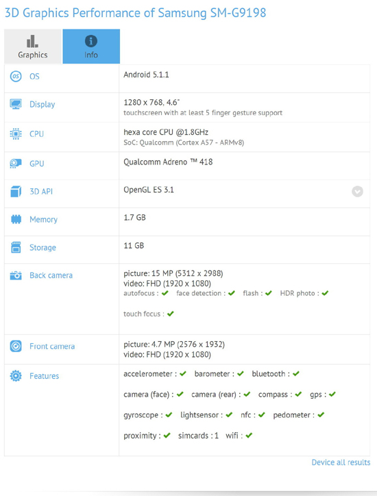 Мини-флагманы занимают определенную нишу на рынке мобильных девайсов и Samsung собирается получить определенные дивиденды от этого и в этом году. В базе данных GFXBench появился смартфон с кодовым обозначением SM-G9198 с полным набором технических характеристик, который предположительно является Galaxy S6 mini. Аппарат получит 4,6” дисплей с разрешением 1280 х 768 точек, чипсет Snapdragon 808 (шесть ядер, графический чип Adreno 418), 2 ГБ ОЗУ, 16-ГБ внутренний накопитель, 16-Мп и 5-Мп камеры и Android 5.1.1 Lollipop. Есть большой набор датчиков и сенсоров. Возможно, сканер отпечатка пальца. Пока неясно, когда смартфон будет представлен. Скорее всего, Samsung не будет долго тянуть с анонсом и мы увидим его этим летом.