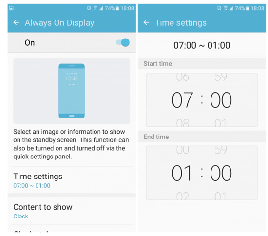 Одной из ключевых "фишек" Galaxy S7 и Galaxy S7 Edge стала функция постоянно активного дисплея Always on Display, позволяющая отображать на заблокированном экране время, календарь, пропущенные уведомления или какое-либо изображение. Изначально этот режим можно было только включить или отключить, но с последним обновлением Samsung добавила возможность пользователю самому устанавливать время, когда Always on Display будет включаться и отключаться.