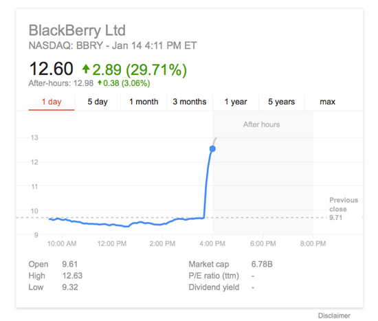 «Акции BlackBerry взлетели на фоне новости о получении предложения о покупке со стороны Samsung. Стоимость ценных бумаг компании выросла на 21%. Южнокорейский производитель оценил стоимость Blackberry исходя из цены в $13,35-15,49 за одну акцию, что от 38 до 60 процентов выше текущей стоимости BlackBerry», – пишет Reuters.
