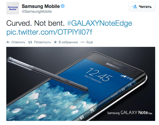 В официальном twitter-блоге мобильного подразделения Samsung появилось изображение смартфона Galaxy Note Edge с загнутым дисплеем. Фотографию сопровождает короткая подпись: «Изогнутый. Не согнутый».