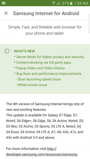 Новая версия браузера также включает Секретный режим, который скрывает данные о просмотре страницы и сайтов, тесную интеграцию с Gear VR, возможность смотреть онлайн-видео и всплывающем окне и одновременно серфить в интернете и многое другое. Браузер доступен для загрузки в Play Маркете многим устройствам компании, которые работают на базе Android 5.0 или выше.