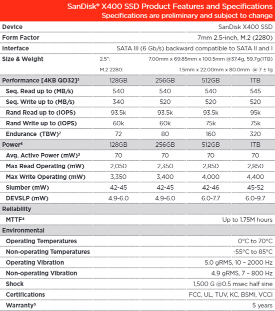 Традиционная версия X400 имеет стандартный корпус толщиной 7 миллиметров, а вариант M.2 — всего 1,5 миллиметра, при этом максимальная ёмкость в обоих модельных рядах одинакова: начинается она от 128 Гбайт и заканчивается на отметке 1 Тбайт. Традиционно для SanDisk в новинках задействованы фирменные технологии компании, такие как nCache 2.0 (SLC-кеширование), DataGuard и LDPC error correction. Это позволяет ей снабжать накопители X400 пятилетней гарантией и гарантировать ресурс записи для старшей модели на уровне 320 Тбайт. Для решений на базе TLC это, пожалуй, выдающийся показатель.