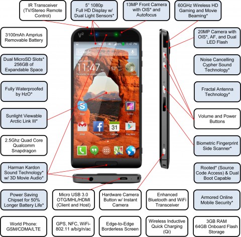 Американская компания Saygus на протяжении нескольких лет не давала о себе знать, однако сейчас она готова вернуться на рынок мобильных устройств со своим новым смартфоном Saygus V-Squared, который имеет несколько достаточно интересных особенностей. Во-первых, Saygus V-Squared получил возможность загрузки двух операционных систем, одна из которых Android 4.4 KitKat (о второй ещё ничего не известно). Также смартфон изготовлен из высококачественных материалов, а его корпус полностью водонепроницаемый. На передней стороне разместились стереодинамики Harman Kardon Sound Technology с технологией 3D Movie Audio, а на правой стороне имеется механическая кнопка спуска затвора камеры и сканер отпечатков пальцев.