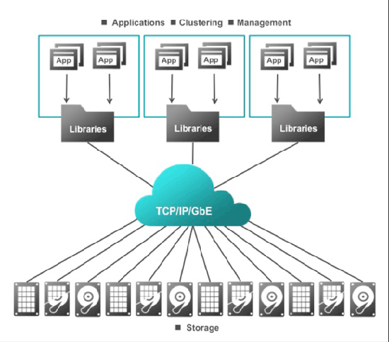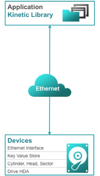 За последние годы было несколько попыток изменить традиционную схему, и разработка Seagate — одна из них. Они предлагают простое и гениальное решение: HDD должны физически подключаться по Ethernet, а интерфейс — простой ассоциативный массив с парами вида «(ключ, значение)», реализованный с помощью протокола Google Protocol Buffers. В итоге мы получаем такое кардинальное архитектуры.