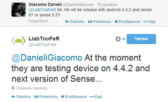 Общаясь с подписчиками в Twitter, разработчик LlabTooFeR, имеющий свои источники в HTC, рассказал о тестировании производителем следующей версии Sense на прототипе M8 (таково кодовое имя будущего флагмана). Оболочка установлена поверх свежайшего Android 4.4.2. Похоже, флагман 2014 года выйдет с актуальной версией операционной системы. Со свежестью ОС на запуске One HTC подкачали, хотя никто из пользователей и не заметил большой разницы — все же оболочка тайваньцев серьезно дополняет Android.