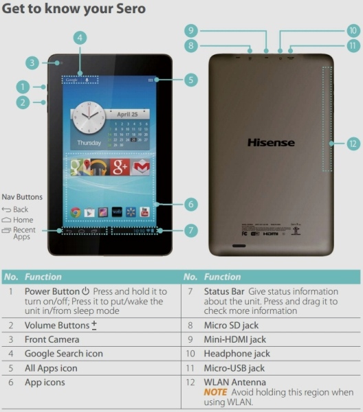 Новинка Hisense Sero 7 будет выпускаться в двух версиях: Lite и Pro. Они будут отличаться начинкой. При этом обе модификации планшета получат 7-дюймовый дисплей с разрешением 1280х800 точек и матрицей IPS. В устройствах будет доступно 1 ГБ оперативной памяти и 8 ГБ флеш-накопителя. Последний можно увеличить за счет карточек microSD. Устройство оборудовано портом mini HDMI и двумя камерами на 5 и 2 мегапикселя. В наличии также Wi-Fi, Bluetooth и GPS. Кроме этого, модель Hisense Sero 7 Pro будет еще иметь NFC. Обе версии планшета работают под управлением Android 4.2 Jelly Bean. Подобными характеристиками обладает планшет Nexus 7, который стал популярным благодаря удачному сочетанию цены и производительности.