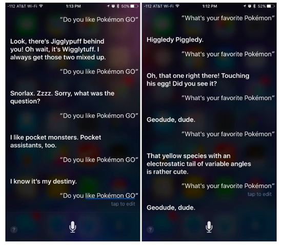 Теперь на вопрос "What's your favorite Pokemon" (Какой покемон твой любимый?) Siri может выдать несколько ответов, один из которых "Вон тот! Который трогает свое яйцо! Видишь?". Странно, но забавно.