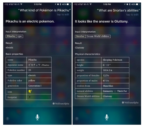 Однако отвечает Siri на вопросы о покемонах только на английском языке. На русском помощник может только ответить, что "не играет в такие игры". А вот если хочешь узнать больше о конкретном персонаже, Siri откроет целую таблицу из WolframAlpha с подробными данными о герое.