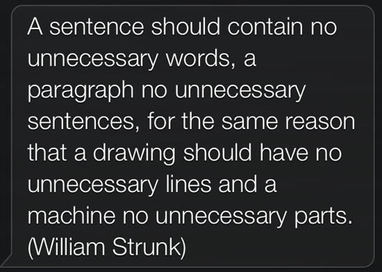 В порядке эксперимента мы попросили ассистентку рассказать нам о том, «что это за фильм, где паренек несколько часов бегает по сказочному миру с кольцом на шее и никому его не отдает, хотя все вокруг постоянно пытаются им завладеть, чтобы ощутить прелести всевластия». В ответ на вопрос она процитировала высказывание американского филолога Уильяма Странка, в котором предложение с избыточными словами сравнивается с машиной с большим количеством лишних деталей: