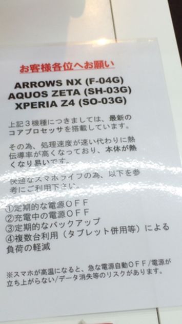 Вчера мы рассказывали, что использование обновлённого Qualcomm Snapdragon 810 не лишило Sony Xperia Z3+ проблем с перегревом. Прототипы смартфона могут отключать приложения из-за слишком высокой температуры. Однако прототипы зачастую работают хуже, чем конечные устройства, может, у рядовых покупателей такой проблемы не будет? Не тут-то было. Кто-то выложил в Line Q фотографию таблички, обнаруженной в одном из официальных магазинов японского оператора DoCoMo.