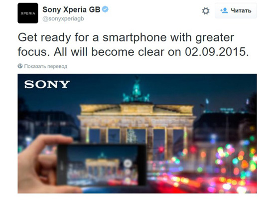 А пока Sony опубликовала в одном из своих официальных Twitter-аккаунтов новый тизер. «Будьте готовы к смартфону с отличным фокусом. Всё станет ясно 02.09.2015» — гласит подпись к размытой фотографии, на которой турист фотографирует достопримечательность, держа в руках смартфон с узнаваемыми чертами Sony.