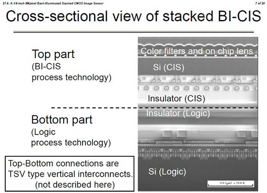Сенсор Sony использует технологию задней подсветки. Изогнутая форма в паре с интегрированной линзой позволяют удвоить светочувствительность по краям изображения, а также увеличить её в 1,4 раза в центре. Компания TSMC в своём докладе предлагает заменить традиционную пластину носителей заряда пластиной ASIC, которая включает часть периферийных схем и подсоединяется к пластине сенсора с помощью специальной технологии склеивания. Такой «стек» отличается почти такими же характеристиками, как и обычный BSI-чип. При этом чувствительность ощутимо возрастает.