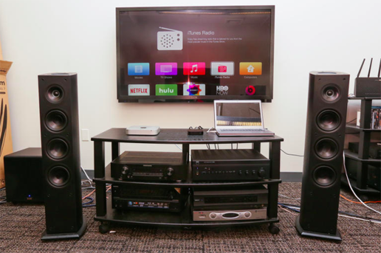 В свою очередь, Apple TV подключили к Blu-ray плееру Oppo BDP-105 с помощью оптического кабеля и вывели сигнал на усилитель NAD C 358BEE, с которого он отправился в колонки Pioner SP-EBF73.