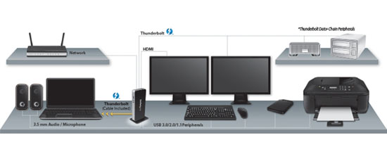 Станция подключается к лэптопу или ультрабуку при помощи единственного кабеля Thunderbolt, предоставляя пользователю богатый набор портов для подключения различной периферии: дополнительных мониторов, принтеров, внешних хранилищ данных, аудиоустройств и др.