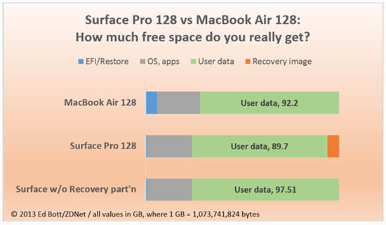 Журналисты ZDNet сравнили фактические показатели свободного места на Surface Pro 128 ГБ и MacBook Air 128. Оказалось, что в ноутбуке Apple пользователь имеет в своём распоряжении 92,2 ГБ, а в планшете Microsoft — 89,7 ГБ или 97,5 ГБ, в зависимости от активации или дезактивации резервирования места под раздел Recovery.