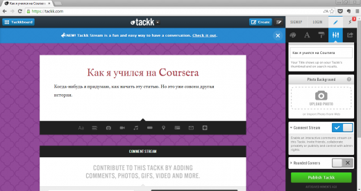 Я решил создать обычную запись в блоге. Структура сразу поменялась, и моя страничка стала представлять из себя заголовок и поле для текста. Набрав там всё, что мне нужно, и выбрав понравившийся цвет, я уже могу завершать её. Tackk предлагает вставить фотографии, включить или выключить комментарии и поделиться записью везде, где только можно.