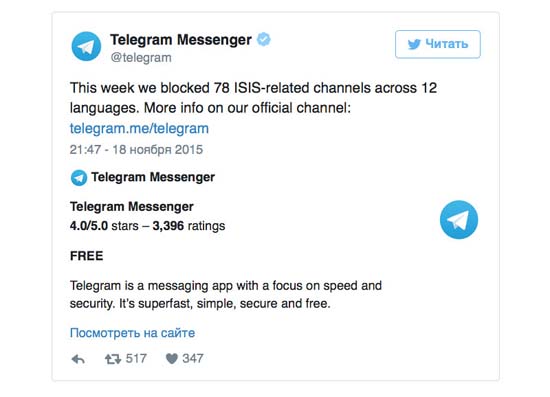 «Мы были обеспокоены, узнав, что ИГИЛ использует публичные каналы Telegram для распространения пропаганды. Мы внимательно изучили поступившие к нам отчеты и приняли соответствующие меры для блокировки каналов», – сказано в сообщении.
