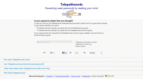 Сколько раз твердили миру о необходимости использования сложных паролей? Надежный пароль должен содержать заглавные и прописные буквы, а также цифры. Но такой пароль сложно запомнить и в последствии использовать, например, набирая его на мобильных гаджетах. Поэтому многие из нас не обращают внимания на основы интернет-безопасности и используют обычные слова. Telepathwords — сервис от исследовательской команды компании Microsoft — предлагает вам обратить пристальное внимание на сохранность своих данных, протестировав применяемые пароли на предсказуемость.