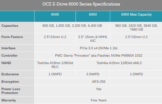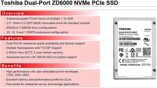 Без каких-либо громких анонсов компания Toshiba расширила семейство серверных твердотельных накопителей ZD6300 до ёмкости 7,68 Тбайт. Пока это самое ёмкое устройство Toshiba, доступное на рынке. Новая модель накопителя предназначена для смешанных нагрузок и использует проверенную временем надёжную память Toshiba A19 eMLC NAND. Из-за повышенной надёжности и использования существенного числа ячеек NAND в качестве резерва, стоимость новинки высока и предварительный заказ обойдётся потенциальному покупателю примерно в $12 тысяч. Официальная же стоимость остаётся неизвестной. Накопитель Toshiba ZD6300 (ZD635E020-7.68T) объёмом 7,68 Тбайт использует контроллер PMC-Sierra под кодовым именем «Princeton»; сейчас он известен как Flashtec NVMe PM8604 1032. Контроллер имеет интерфейс PCI Express 3.0 x8, который делится на два раздела по четыре линии, 16 каналов NAND и поддерживает протокол NVMe 1.1b.