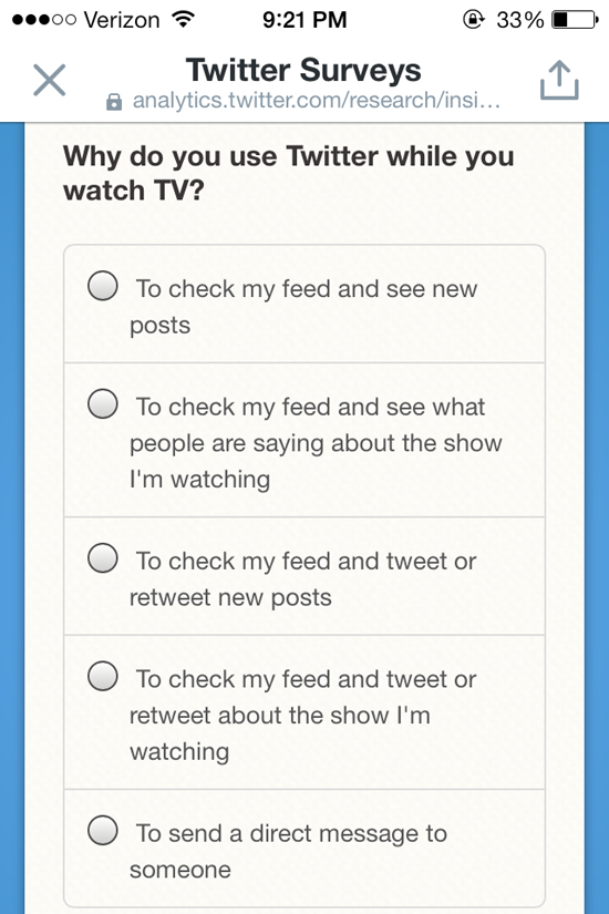 Исследование Twitter включает в себя серию онлайн-опросов среди американских пользователей. Первый вопрос добровольцы, согласившиеся принять участие в исследовании, получили сразу же после начала трансляции популярного в США Monday Night Football.