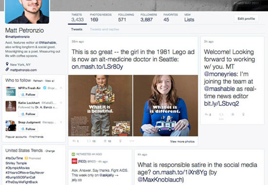 Обновления в профиле Twitter первым заметил редактор Mashable Мэтт Петронзио (Matt Petronzio). Зайдя в твиттер-аккаунт, журналист обнаружил, что его аватар и раздел «о себе» переместились в левую часть страницы, а к статистике твитов и подписчиков добавился счетчик загруженных фотографий и видео.