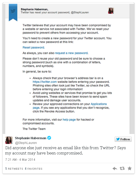 О получении писем с просьбой переустановить пароль пользователи Twitter стали сообщать в ночь на 4 марта. Судя по появившиеся в соцсети скриншотам, в тексте письма отмечалось, что сменить пароль требуется из-за взлома аккаунта и получения к нему доступа «ресурсами, не связанными c Twitter».