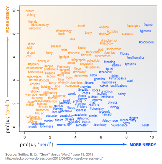 Была составлена диаграмма используемых понятий и предметов. На ней, чем выше нуля оценка, тем два слова чаще встречаются вместе. Двигаясь вверх по вертикальной оси, слова становятся все более «гиковскими» (#музыка → #гаджет → #косплей), а слева направо — более «нёрдовскими» (Образование → Грамматика → Неврология). Слова по диагонали можно отнести как к «гикам», так и к «нёрдам»: это социальные оценки (#странный, чудак), технологии (#компьютеры, #Microsoft), фэнтези персонажи («Доктор Кто», #Хоббит), объясняет IO9.