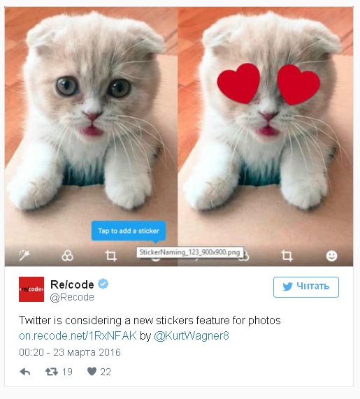 Сеть микроблогов Twitter тестирует новую услугу для пользователей, которые смогут добавлять некие стикеры-наклейки на публикуемые сообщения, сообщает портал Re/code.