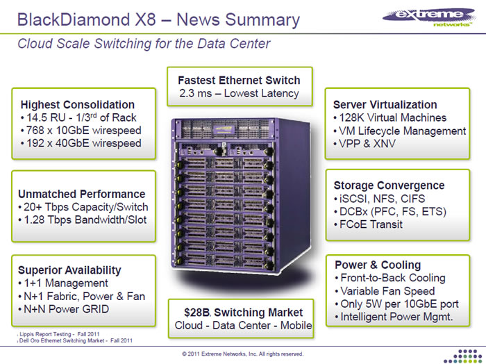 Решение Extreme Networks Open Fabric включает: BlackDiamond X8 модульное шасси, первое на рынке 20-терабитное шасси до 768 неблокируемых 10G портов или 192 неблокируемых 40G портов, занимает всего треть стойки и будет поддерживать порты 100G.BlackDiamond OS X коммутаторы серии предлагают предприятия и облако сети ЦОД, наивысшую производительность в отрасли. В BlackDiamond X серия коммутаторов обеспечивает высочайшую плотность 10 GbE и 40 GbE для гибкость в построении корпоративных базовых сетей и облако центров обработки данных. Благодаря высокой масштабируемости, BlackDiamond X коммутаторы серии предлагают 1.28 Tbps слот потенциала, более 20 Tbps коммутации мощности, и до 768 портов 10 GbE или 192 портов 40 GbE на шасси. Все это доступно в очень малой площади одной трети стойку размера (14.5 RU).