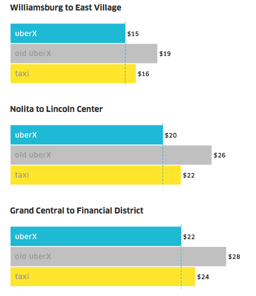 Во вторник, 6 июля, Uber анонсировал снижение расценок на поездки на такси UberX в Нью-Йорке на 20%. Этот шаг позволит сервису в финансовом плане стать более привлекательным для пассажиров, чем знаменитое на весь мир нью-йоркское желтое такси. Неделей ранее было объявлено о снижении тарифов UberX в Сан-Франциско на 25%, а еще раньше — в июне, — Uber снизил цены и в Лос-Анджелесе. Компания уверяет, что водители UberX в Калифорнии (но не в Нью-Йорке) по прежнему будут получать оплату на уровне 80% от цены поездки до снижения стоимости. Журналисты подсчитали, что поездка по Сан-Франциско, которая раньше обходилась пассажиру в $15 теперь подешевеет до $11,25, но водитель все равно получит $12.