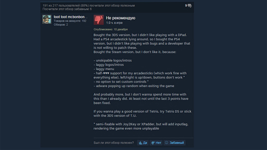 «Купил версию игры для Nintendo 3DS, но мне не понравилось играть на D-паде. Под руками валялся аркадный джойстик для PlayStation 4, поэтому купил игру для PlayStation 4, но не понравилось играть с багами и разработчики, которые не хотят патчить игру. Купил версию игры в Steam, получил интро без возможности их пропустить, которые в добавок еще и лагают, лагающее меню, неполноценную поддержку моего аркадного джойстика, отсутствие возможности переназначить управление и появление рекламы после выхода», — отметил один из пользователей.