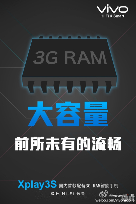 Появился тизер, который подтверждает, что новый флагман Vivo Xplay 3S получит 3 ГБ оперативной памяти! В итоге, на данный момент официально известно, что Vivo Xplay 3S будет оснащен дисплеем с рекордным разрешением 2K (2560 х 1440 пикселей), самым мощным 4-ядерным процессором Snapdragon 800 с частотой 2,3 ГГц, поддержкой сетей 4G LTE, продвинутым звуком уровня Hi-Fi и, наконец-то, 3 ГБ RAM.