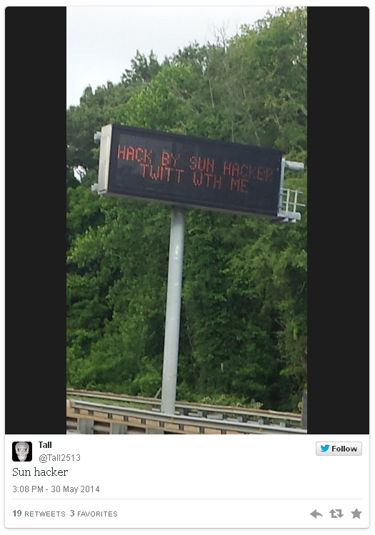 Начиная с конца мая, неизвестный злоумышленник под псевдонимом Sun Hacker взламывал дорожные табло, выводя на них своё имя, и даже однажды пригласил очевидцев поболтать с ним в Твиттере. По информации департамента транспорта Северной Каролины, всего таким образом хакер взломал пять дорожных знаков по всей стране, а первый случай произошёл 27 мая.