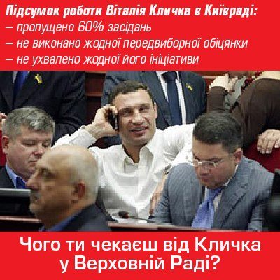 Сам В. Кличко во время телепрограммы «Один на один» с Савиком Шустером на Первом национальном канале в понедельник вечером посетовал: «Партнеры по оппозиции обливают нас грязью, заявляя, что мы являемся тем или иным проектом, используют «черные» технологии, срывают агитпродукцию. Я не буду жаловаться, но те действия, которые происходят, не соответствуют тем договоренностям, которые были сделаны… » (речь идёт о соглашении о взаимном ненападении от 22 января 2012 года).