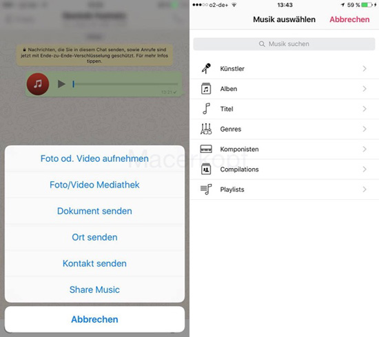 Немецкий ресурс Macerkopf протестировал последнюю бета-версию мессенджера WhatsApp, в которой появилась функция отправки музыкальный файлов. Делиться можно не только треками, хранящимися в памяти смартфона, но и через Apple Music.