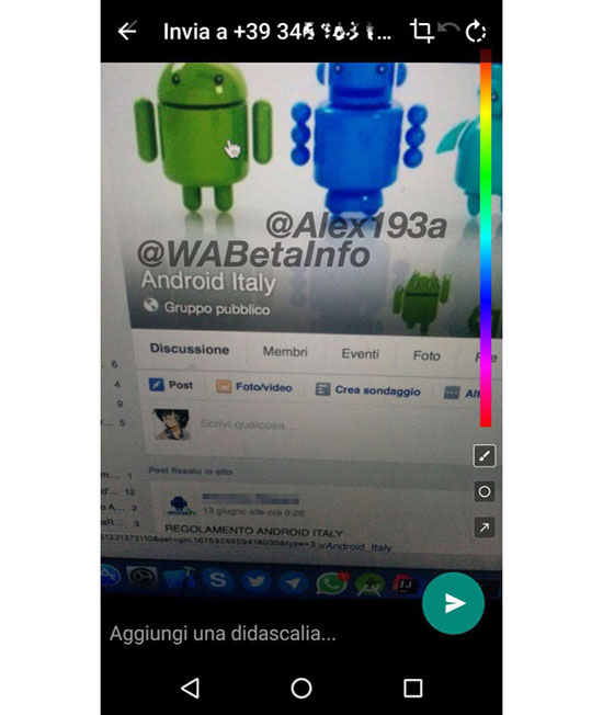 Также разработчики обнаружили возможность корректировать фотографии непосредственно в WhatsApp: на изображениях можно рисовать и добавлять различные эффекты, а затем отправлять другим пользователям. Схожую функцию Apple показала на презентации iOS 10 на WWDC: в новой версии iMessage можно отправлять зарисовки, вспышки, сердцебиение и многое другое. У Apple рисовать можно даже поверх видео.