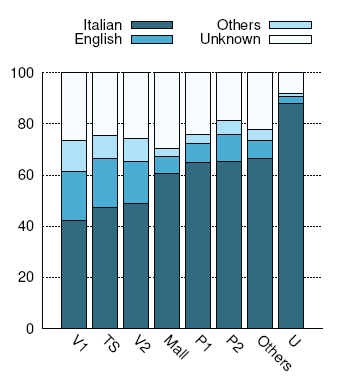 Распределение по языкам в разных местах прослушки: V1 и V2 — Ватикан, TS — железнодорожная станция, U — университет