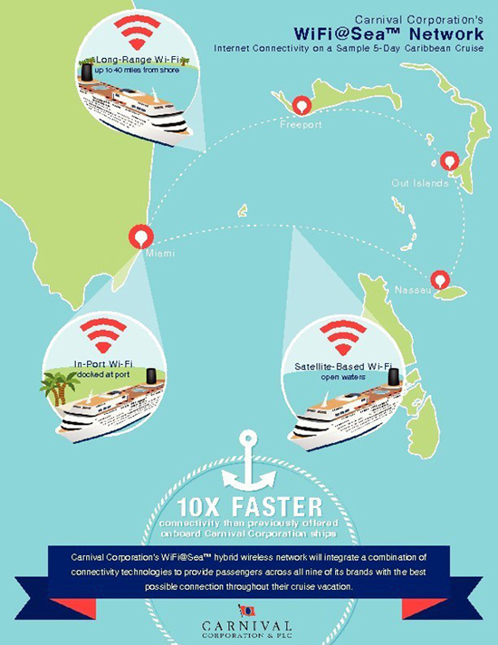 На этой неделе компания Carnival Corporation, крупнейший в мире оператор круизных судов, объявила о запуске первой в своём роде гибридной беспроводной сети WiFi@Sea, которая будет работать на всех лайнерах Carnival Corporation (101 штука).