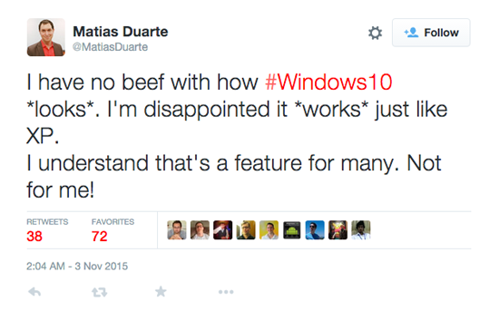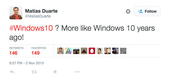 По мнению Матиаса Дуарте, который создал Material Design в Android, Windows 10 больше похожа на Windows 10-летней давности. Сообщение подобного содержания он опубликовал в своем Twitter-аккаунте.