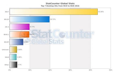 Windows 7 закономерно теряет долю рынка, что позволяет Microsoft надеяться на то, что к моменту прекращения поддержки в 2020 году она будет не столь распространена, как Windows XP к окончанию своего жизненного цикла. На минувшей неделе доля Windows 10 выросла до 19,72%, а у Windows 7 снизилась до 43,56%. OS X и Windows 8.1 отстают с результатами 9,77% и 9,63% соответственно.