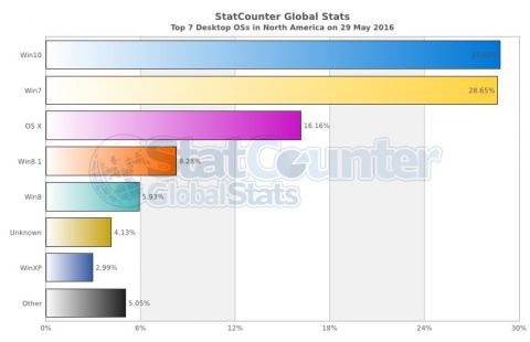 Один из разработчиков браузера Edge в Твиттере опубликовал статистику, согласно которой 29 мая Windows 10 была лидером среди операционных систем на ПК в США с долей 28,82% против 28,65%. На третьем месте располагается Apple Mac OS X с результатом 16,16%.