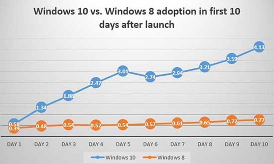 По итогам первых 10 дней после релиза Windows 8 заняла всего 0,77% рынка, что не удивительно – в 2012 году пользователям приходилось платить за лицензию или покупать новый компьютер. У Windows 10 таких ограничений нет, и доля платформы оказалась в пять раз выше – 4,13%.