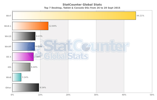 Теперь благодаря статистике StatCounter стало известно, что Windows 10 достигла нового рубежа, а именно, превзошла Windows XP на рынке настольных операционных систем: 8.23% против 8.03% у XP. Тем не менее, «десятке» предстоит пройти еще долгий и сложный путь. В то время как отрыв от Windows 8.1 составляет всего 4.61%, до основной цели, всемогущей «семерки», все еще довольно далеко. По данным StatCounter, 7 версия операционной система удерживает целых 44.21% рынка.