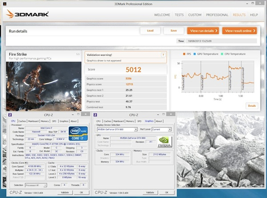 3DMark Fire Strike. Частота процессора 4.16 ГГц = 34x122 МГц. Результат – 5012 баллов